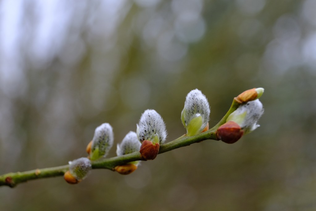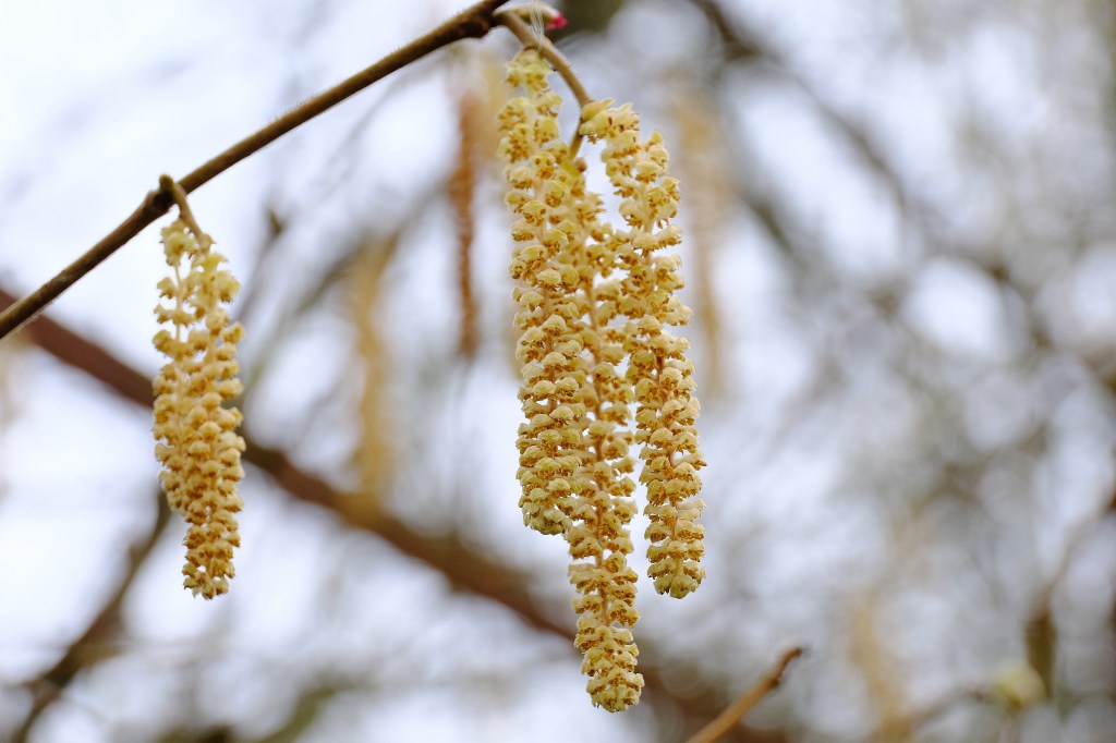 The yellow catkins are the male flowers, but look closely at the top of the photo and you will see the tiny red female flower. Gently flick the yellow catkins to see the pollen fall out.