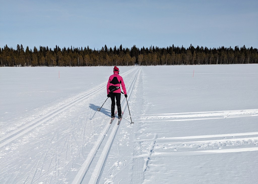 I was just getting peckish as we skied through the woodland in a break made for both us and a power line when we arrived at the Kuontivaara cafe. The tiny homely interior was hot and full so we ate our dill sprinkled salmon open sandwiches and cloudberry tarts and drank our strong dark coffee outside on the sunny picnic benches. The faster group joined us and it became clear that our clockwise direction had been the best choice for us, we might have to walk down a couple of steep sections but they had worked hard and ascended them. We waved goodbye and pushed on, this time through more remote feeling territory. A cold wind picked up and as we skied across the final lake to the bus stop, the cut tracks filled with icing sugar snow. Our timing for the bus back was excellent and I felt satisfaction as a relative beginner in completing the 15km circuit.